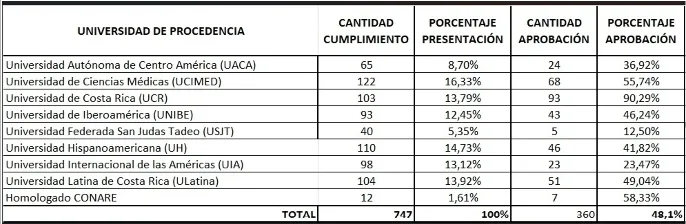 A nivel de desempeño por procedencia académica, la Universidad de Costa Rica (UCR) registró el porcentaje más alto de aprobación, seguida por los médicos con títulos homologados por CONARE y la Universidad de Ciencias Médicas (UCIMED), que se ubicaron entre los mejores resultados de esta convocatoria.