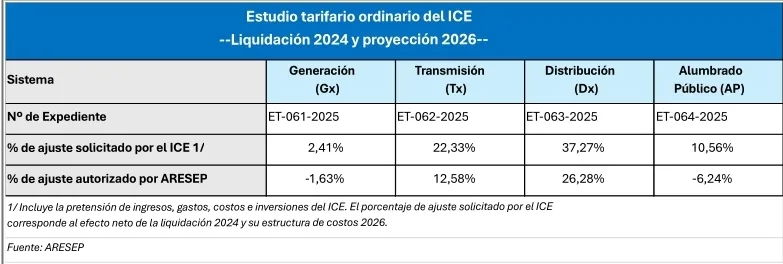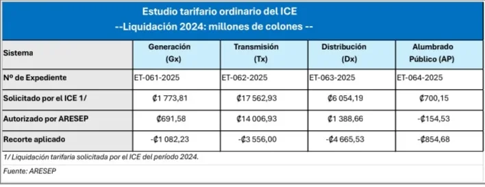 Como parte del estudio, el ICE presentó la liquidación tarifaria del período 2024 y la proyección de su estructura de costos para el 2026. En la revisión de la liquidación tarifaria del 2024, la ARESEP rechazó alrededor de ¢10.000 millones (diez mil millones) solicitados por el ICE. Los costos no aceptados fueron los siguientes: