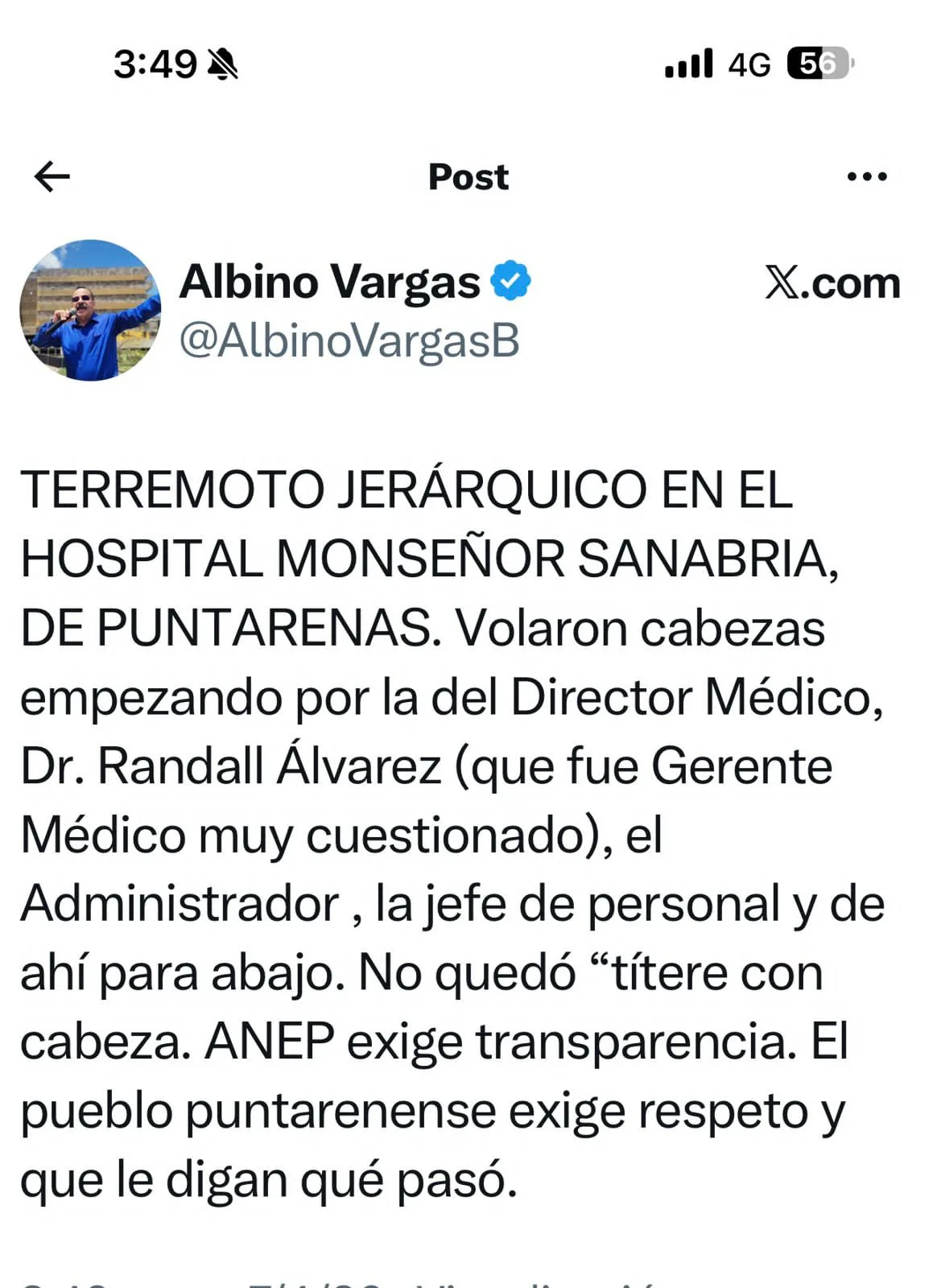 Albino Vargas, secretario general de la Asociación Nacional de Empleados Públicos y Privados se expresó sobre la situación en el hospital de Puntarenas en cuenta de X